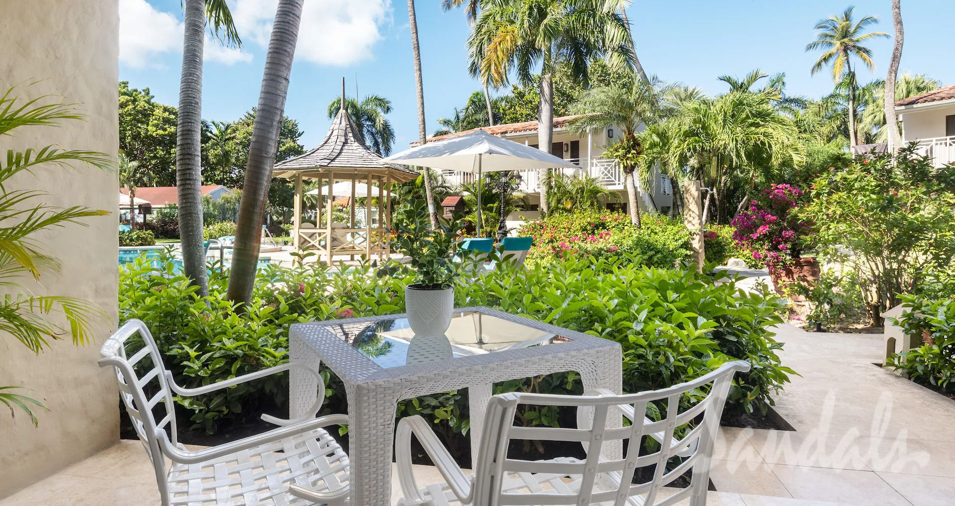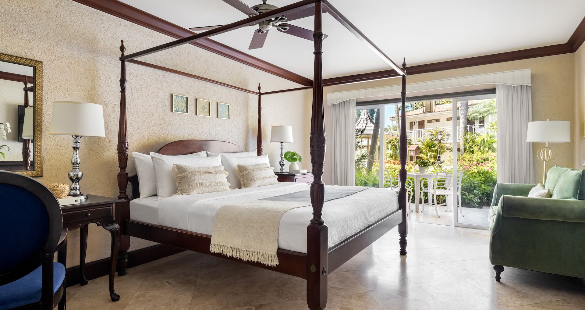 Located on the ground floor of the Flamboyant and Oleander buildings, this spacious room features a private patio that opens directly onto a quiet cottage pool surrounded by beautifully landscaped gardens. The room features a four-poster, king-size bed, flat screen TV, and an en-suite bathroom with a bathtub/shower combination. For your refreshment, your room includes Robert Mondavi varietal wines and a refrigerator stocked with bottled water, juice, soda and local beer.